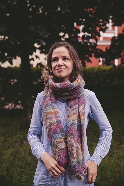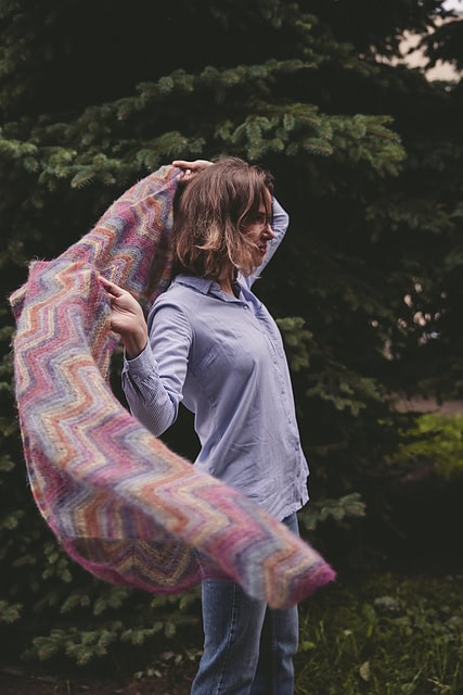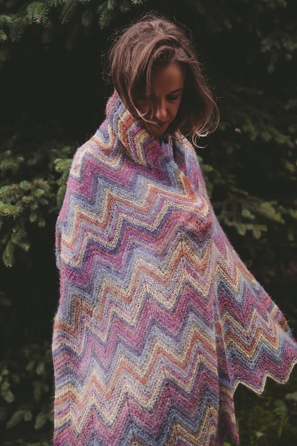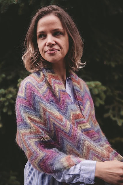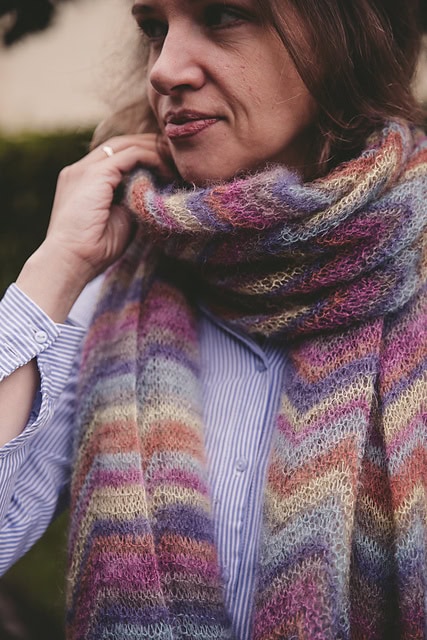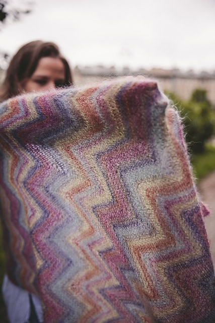 Worked in luxurious Sandnes Garn Tynn Silk Mohair Print (4 skeins) or any different printed silk mohair on 4.5 mm (US 7) needles, it drapes softly while remaining cozy and comfortable.