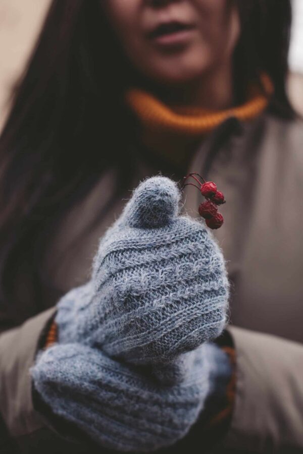 After completing the mittens, hide the yarn tails and perform wet-heat treatment (WHT). Use mitten blockers to give the mittens the perfect shape.